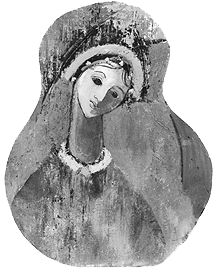 The Blue Madonna exists primarily because the artist wanted to share her own reaction to the woman who is known, theologically, as “The God Bearer.” To begin with, this is no real woman of flesh, blood, passion, and desire. In contrast to many other artistic renditions of this basic Christian theme, Moss does not intend her Madonna to remind its viewers of some regal queen, or an old love, or even of one’s long suffering mother. The falling shoulders and the extremely long neck, as well as the gentle tilt of the head, are meant to discourage such associations. This is a new creation that the viewer’s eyes are allowed to enter wherein they are expertly directed by the artist’s use of lines of composition, contrasting colors, and obvious textural effects finally to the brilliant deep green eyes of the piece itself. It is in the very depths of these unusual eyes, that the viewer’s gaze comes to rest, caught in the loving reflection of a holy woman’s maternal, ageless, and unconditional concern for all creation.