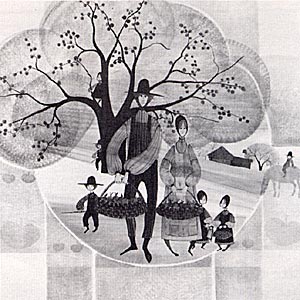 This is a black and white illustration of a color print.