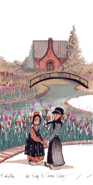 The Bridge at Central College features The Chapel on the campus of Central College in Pella, lowa. The two Dutch children celebrate Pella’s annual Tulip Time festival.