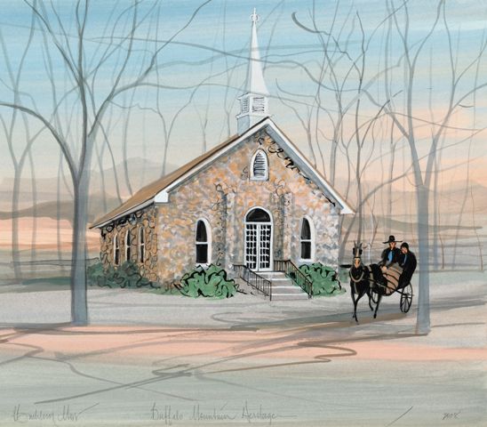 This print depicts the Mayberry Presbyterian Church located in Patrick County, Virginia. It is one of five historic rock churches located on the Blue Ridge Parkway. Buffalo Mountain is in the background.