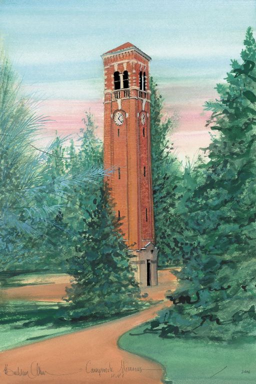 This print features the cherished campanile on the campus of the University of Northern Iowa.