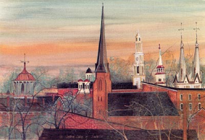 The Clustered Spires of Frederick, the visual essence of the Maryland town, have been memorialized by the American poet, John Greenleaf Whittier, in this poem Barbara Fritchie. Built in the 18th and early 19th centuries, the spires are the favored image of Frederick residents and visitors alike.
