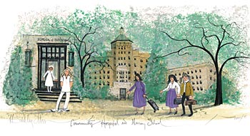This print commemorates the 100th anniversary of The Community Hospital and Nursing School in Springfield, Ohio. The school began operations in 1887 as a 12-bed facility known as Mitchell-Thomas Hospital. In 1904, a second building, City Hospital, began operations. Along with it the Community Hospital School of Nursing opened with its first class of 5 students.