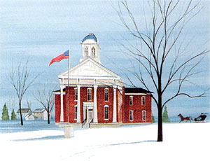 This print features the courthouse built in 1858 for Mitchell County, in Osage, Iowa.