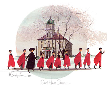 Court House Chorus portrays the Shenandoah Valley Children’s Choir performing at the holiday tree lighting ceremony in front of the Rockingham County Courthouse, Harrisonburg, Virginia. The choir is part of the Preparatory Music Department at Eastern Mennonite University in Harrisonburg. Julia J. White, who founded the choir in 1992, continues as its artistic director and is present in the print along with the choristers. The choir frequently performs in national and international concerts, including the 1997 Pageant of Peace National Christmas Tree Lighting in Washington, DC.