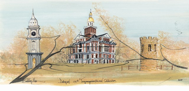 This print celebrates Dubuque, Iowa’s anniversary date of June 1, 1833-2008. The anniversary marks 175 years since the Black Hawk Purchase Treaty went into effect, legally permitting pioneers to settle in the area now known as Dubuque. Dubuque County Courthouse, the Shot Tower, and the Town Clock are featured in the print.