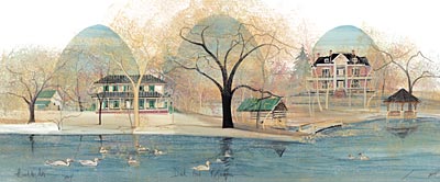 Duck Pond Reflections portrays Virginia Tech in Blacksburg, Virginia. The white house on the left is “Solitude” which is the oldest structure still standing on the campus, built in 1859. The brick house, known as “The Grove,” is the University President’s home, built in l902.
