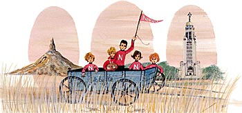 This print features Nebraska Cornhusker fans near Chimney Rock, an Omaha landmark, and the State Capital Building.