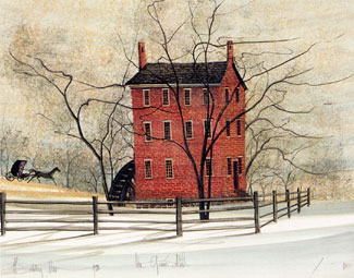 The Grain Mill depicts Graue Mill, the only operating waterwheel grist mill in Illinois. In 1852, Fred Graue turned the wheel and opened the sluice gates for the first time. The Graue family ran the mill for the next 60 years. The cellar of the mill is one of three authentic underground railway stations in Illinois where runaway slaves found haven.