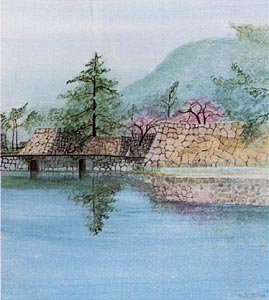 This print features the Mori family castle, Honshu Island, Japan.