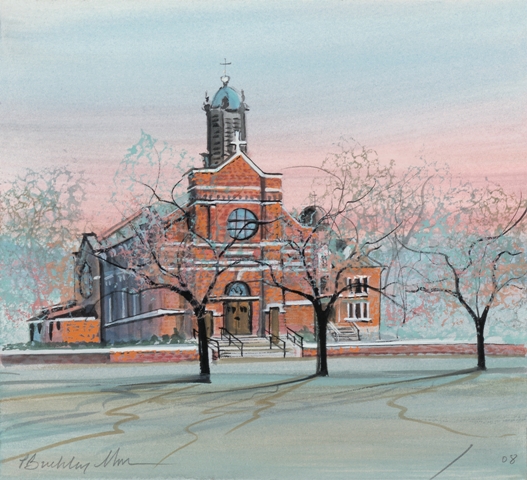 This print depicts the Immaculate Conception Church in Cedar Rapids, Iowa. The church was founded in 1858.