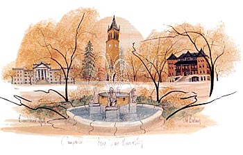 This print features three of the Ames, Iowa, campus stately structures: Beardshear Hall, the Campanile and Old Botany.