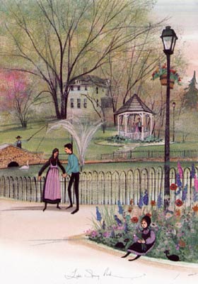 Lake Spring Park, once the source of water for much of Salem, Virginia, has been transformed into a beautiful gathering place for all. Special events, such as fishing, rodeos for children and senior days, are numerous at the park. Pat has created this print for the 20th annivesary of Olde Salem Days.