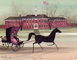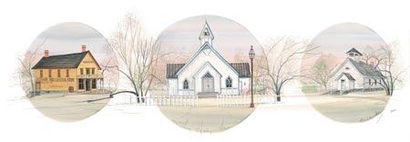 Living History Farm depicts the general store, the church, and the school at the historic site by the same name near Des Moines, IA. A portion of the sale of each print will be contributed to Living History Farms.
