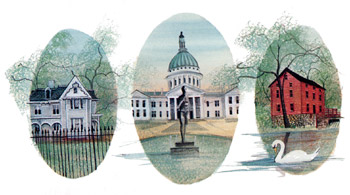 Missouri Memories Featured on the left in this triptych is the home of Harry S. Truman in Independence, which was built in 1867 by George Porterfield Gates, the Grandfather of Bess Wallace who later married Truman in 1919. During Truman’s presidency, this home was known as the “Summer White House.” At center is the Old Courthouse, St. Louis, where in 1847, a black man named Dred Scott sued for his freedom, beginning a legal case which helped ignite the Civil War. The Alley Spring Mill, Eminence (on the right), once a productive flour mill, is now part of the Alley Spring National Park Site. The mill, which now houses exhibits and photographs of the history of the Ozark landmark, can be toured during the summer months.