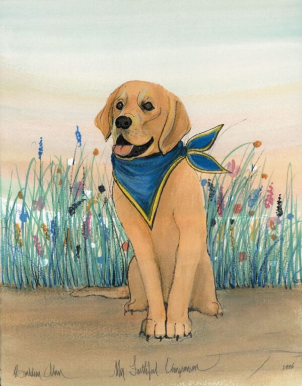 My Faithful Companion was created in honor of companion dogs, and a portion of the proceeds from the sale of this print will raise money for Canine Companions for Independence, a non-profit organization that breeds, trains, and places highly skilled assistant dogs with people with disabilities other than blindness. Most of the companion dogs are a Lab and Golden Retriever mix.