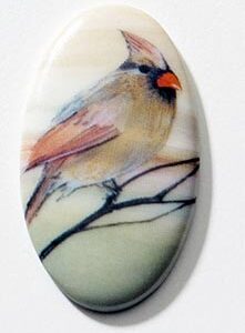 A unique concept in fine art jewelry. A gold colored setting designed by Pat Moss surrounds your choice of P. Buckley Moss images. The fine porcelain centerpieces are interchangeable.