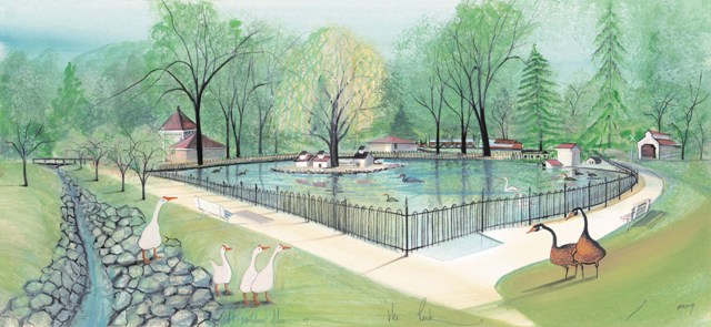 The Park depicts Gypsy Hill Park located in historic Staunton, Virginia. Pat’s delightful rendering of the Staunton park features the duck pond (Lake Hutchens) and the historic Gypsy Express mini-train, which appears in the background.