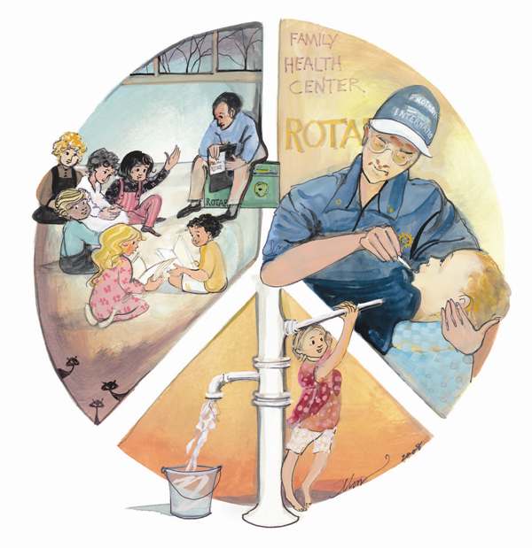 Honorary Rotarian P. Buckley Moss has teamed up with Rotary District 7570 to create this fine art depiction of Rotary. Taking Peace through Service as a theme, Pat shows Rotarians at work dispensing polio vaccine, providing clean water, and promoting literacy.