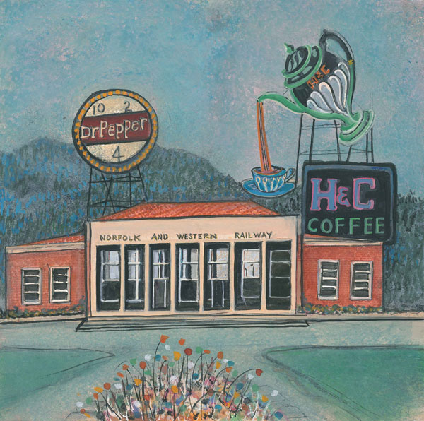 Roanoke Landmarks features the Norfolk and Western Railway Station and the Dr. Pepper and H&C Coffee neon signs in Roanoke, Virginia.