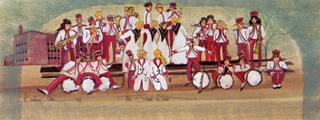 The School Band features Osceola High School, Osceola, lowa, where the first class of 40 students graduated in 1919. The building is currently in a state of decay and the future of the landmark is questionable. Along with the school, this print provides a candid view of the Clarke Community High School Band, which has 115 members and is directed by Brad Lampe.