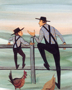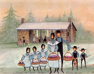 This print features Pat’s unique Plain People gathering at the old picnic shelter at the Waynesboro City Waterworks, located in the Virginia mountain region.