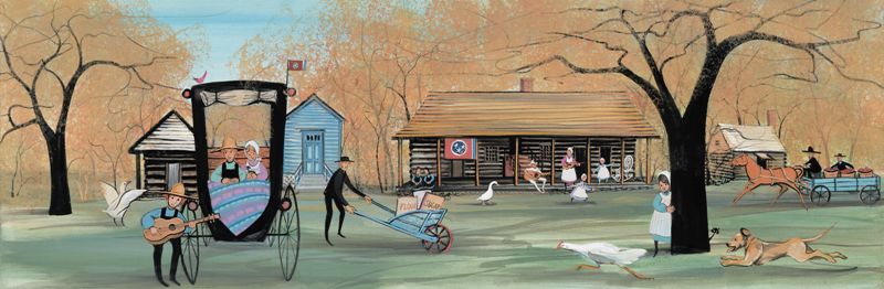 This print depicts historic Exchange Place in Kingsport, Tennessee, which functioned as a family farm in the mid-1800’s, but also has a unique history. Three times a week when the stagecoach ran carrying mail, freight and passengers, it stopped in this location so Virginia currency could be exchanged for that of Tennessee.