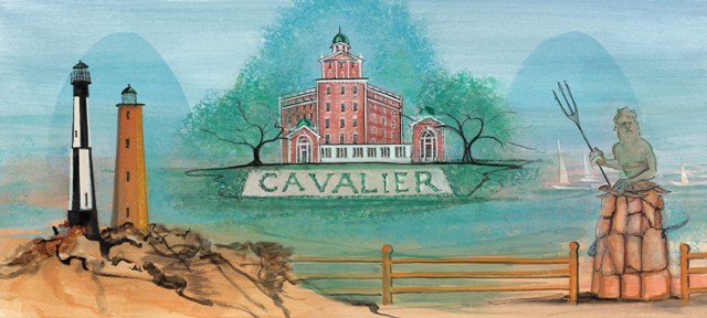 Virginia Beach Treasures celebrates summer at Virginia Beach, VA. The image includes the historic Cavalier Hotel, both Cape Henry Lighthouses, and the statue of King Neptune, combining attractions both old and new.