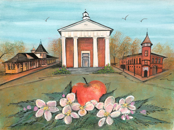 Winchester, Apple Country, features Winchester, VA’s historic B&O Train Station, the Frederick County Court House, and the Rouss Fire Hall, as well as a symbolic apple and blossoms to celebrate the area�s annual Apple Blossom Festival.